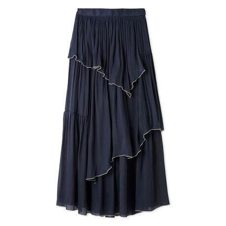 <b>【光を纏うシアーな質感と、アシンメトリーなメローフリルが躍動する主役級スカート】</b>