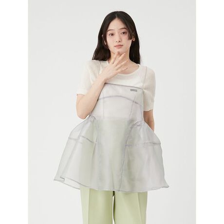 <b>【光沢糸が放つ繊細な艶とロゴテープのアクセント。旬のレイヤードを楽しむシアーニット】</b>