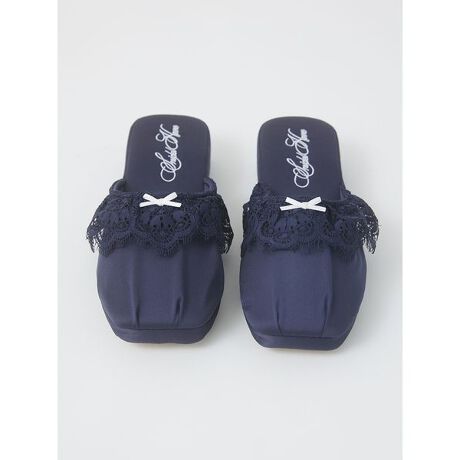 レースとリボンでデコレートした、ややヒール高のあるミュールタイプのルームシューズ。