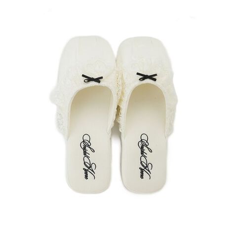 レースとリボンでデコレートした、ややヒール高のあるミュールタイプのルームシューズ。