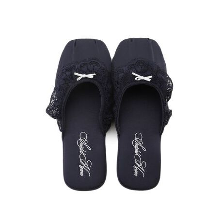 レースとリボンでデコレートした、ややヒール高のあるミュールタイプのルームシューズ。