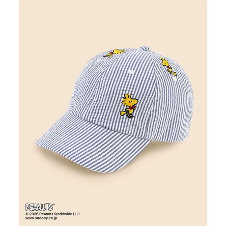 夏のプレッピースタイルに欠かせないシアサッカー生地にウッドストックの刺繍を散りばめたベースボールキャップ