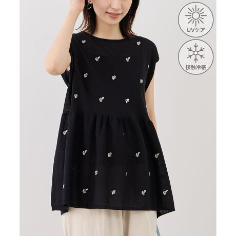 シャーベットニット 刺繍シアーペプラムニット/UVケア・接触冷感
