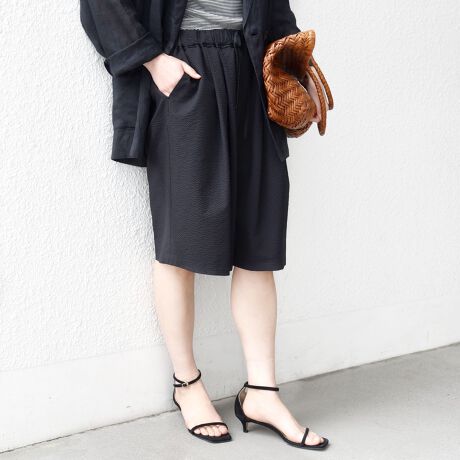ショートパンツも大人っぽい丈感にしている為、ラフにTシャツ、女性らしいサンダルを履くシンプルコーディネートでも大人な印象に。