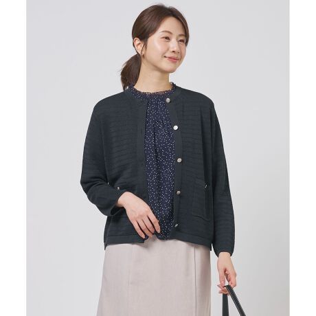 ■デザイン編み柄で表情豊かに仕上げた、クラシカルでコンパクトなシルエットのサマーニットジャケット。 ニット素材を使用することで、ジャケット特有の堅苦しさを感じさせない、軽やかでナチュラルな雰囲気を演出します。フロントには紋章入りのメタル釦をあしらい、上品なトラッド感をプラスしました。袖丈は手首がのぞく9分袖で、涼しげな印象に。蒸し暑い季節のビジネスシーンでも、肩の凝らない軽い着心地で快適にお過ごしいただけます。カラーは、軽やかな印象のライトグレー(#003)、肌なじみ良いライトベージュ(#033)、シーンレスに活躍するネイビー(#075)の3色展開です。