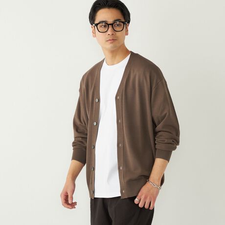 ハイゲージで編みたてた生地と、光沢あるフロントボタンが上品な印象をあたえてくれます。