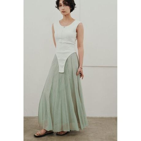 [型番:500JSM31-3881]モデル身長167cm(Mサイズ着用)表情感のあるシアー素材を裾にかけてピンタックパネルで広げた存在感のあるスカート。一枚でスタイリングに華やかさをプラス。バックゴム仕様なので楽に着用頂けます。透け感あり(裏地付き)、ストレッチなし。【お手入れ方法】ドライクリーニング