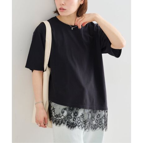 裾には斜めにレースをあしらい、シンプルな中にもさりげないデザイン性をプラス。動きのあるアシンメトリーなディテールが、今の気分にぴったりな一枚です。