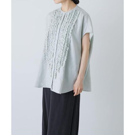 テープ状の共布でフリルをあしらったワイドシャツ。上品で甘さは控えめ、大人も手に取りやすいデザインに仕上げました。ノーカラーなのでかしこまりすぎず、程よくラフなムードをまとっています。生地はしなやかな素材感のハードマンズリネンを使用。フランスのノルマンディ地方で収穫された原料を伝統的な紡績方法で紡ぎ、織り上げました。絶妙なハリが気になる部分を上手にカバーしスッキリとした印象に。前開きなので羽織ることもでき、上からカーディガンやジャケットを合わせるスタイリングもおすすめです。いつものボトムを合わせるだけで新鮮な装いが叶います。同素材のシリーズアイテムもぜひご覧ください。
