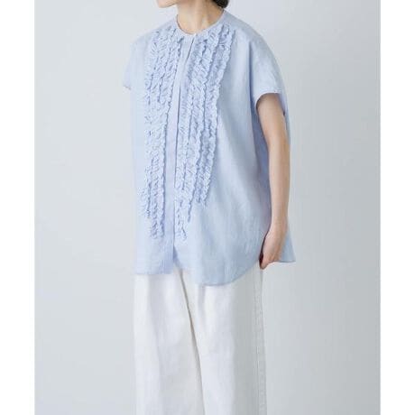 テープ状の共布でフリルをあしらったワイドシャツ。上品で甘さは控えめ、大人も手に取りやすいデザインに仕上げました。ノーカラーなのでかしこまりすぎず、程よくラフなムードをまとっています。生地はしなやかな素材感のハードマンズリネンを使用。フランスのノルマンディ地方で収穫された原料を伝統的な紡績方法で紡ぎ、織り上げました。絶妙なハリが気になる部分を上手にカバーしスッキリとした印象に。前開きなので羽織ることもでき、上からカーディガンやジャケットを合わせるスタイリングもおすすめです。いつものボトムを合わせるだけで新鮮な装いが叶います。同素材のシリーズアイテムもぜひご覧ください。