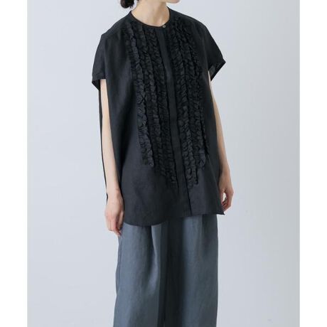 テープ状の共布でフリルをあしらったワイドシャツ。上品で甘さは控えめ、大人も手に取りやすいデザインに仕上げました。ノーカラーなのでかしこまりすぎず、程よくラフなムードをまとっています。生地はしなやかな素材感のハードマンズリネンを使用。フランスのノルマンディ地方で収穫された原料を伝統的な紡績方法で紡ぎ、織り上げました。絶妙なハリが気になる部分を上手にカバーしスッキリとした印象に。前開きなので羽織ることもでき、上からカーディガンやジャケットを合わせるスタイリングもおすすめです。いつものボトムを合わせるだけで新鮮な装いが叶います。同素材のシリーズアイテムもぜひご覧ください。