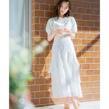 動きのあるシルエットが映えるアシメティアードレーススカート【Design】・アシンメトリーに重ねたティアードデザインが目を惹くレーススカート。・動くたびに揺れる軽やかなシルエットで、女性らしい雰囲気を演出します♪・レース素材が華やかさをプラスし、コーディネートの主役になる一枚◎・後ろゴム仕様で着心地がよく、レースアップでシルエットを調整できるデザインです!・左ファスナー仕様・裏地付き【Fabric】・レース素材を使用し、上品な印象に。・ホワイト、サックス、ブラックの3色展開となります。【Care】ドライクリーニング