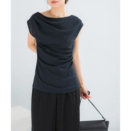 やわらかな綿混素材に、ひんやりとした接触冷感機能をプラスした、これからの季節に頼れる一枚。さらっとした肌あたりで、暑い日も心地よく着られます。片側に入れたショルダータックがさりげないアクセントになり、ドレープが上品なニュアンスをプラス。シンプルながらも着るだけで雰囲気が出るデザインです。身体のラインを拾いすぎないシルエットで、すっきり見えと安心感を両立。きちんと感のあるパンツからデニムまで幅広く合わせやすく、デイリーに活躍してくれます。