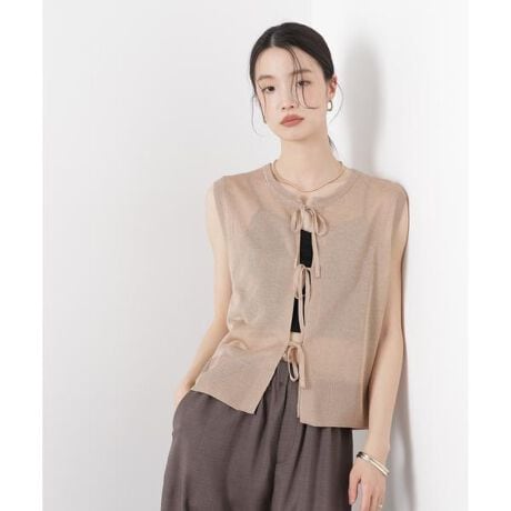 リボンのレースアップデザインが視線を惹きつけるノースリーブニット。フロントはリボンで留めるオープン仕様になっており、前後どちらでも着用可能な2wayデザインが魅力。気分やスタイリングに合わせて表情を変えられる、着回し力の高い一枚です。