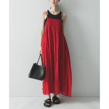 胸元のシャーリングが華やかさを添え、着映えを叶える。コットンギャザーキャミワンピース。