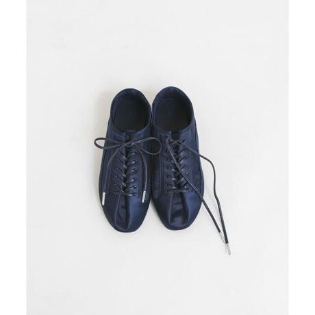 内に折ったタン部分がポイントのサテンスニーカー。あえてシューレースを華奢な合皮タイプにし、先に金具を付けることで引き締めた印象にしました。軽く柔らかいので履き心地もいいです。いつもの着こなしにプラスするだけでお洒落な足元に仕上げてくれます。