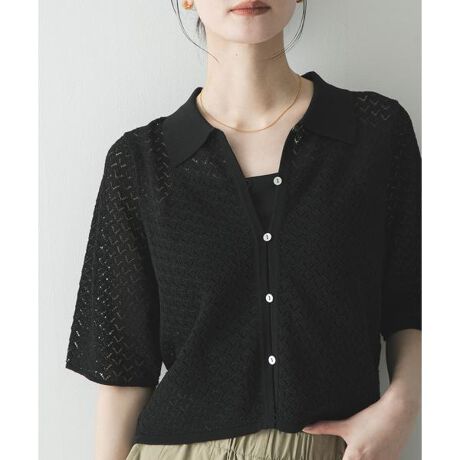 繊細なレース柄が装いに奥行きを与える、シャツカラーレースニット。