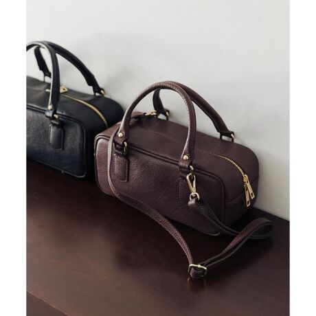 クラシカルなスクエアフォルムが、装いにアクセントを添える。レザーボストンバッグ。