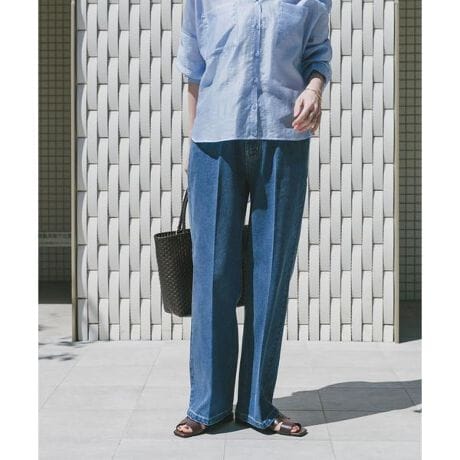 センタープレス入りで脚のラインをすっきりと見せ、スタイルアップが叶うデニムパンツ。カジュアルになりがちなデニムにきちんと感をプラスし、大人の着こなしにぴったりの一本です。ウエストは内側に調整紐を備え、見た目を損なわず快適なフィット感に。Tシャツからブラウスまで幅広く合わせやすく、オンオフ問わず活躍するアイテムです。