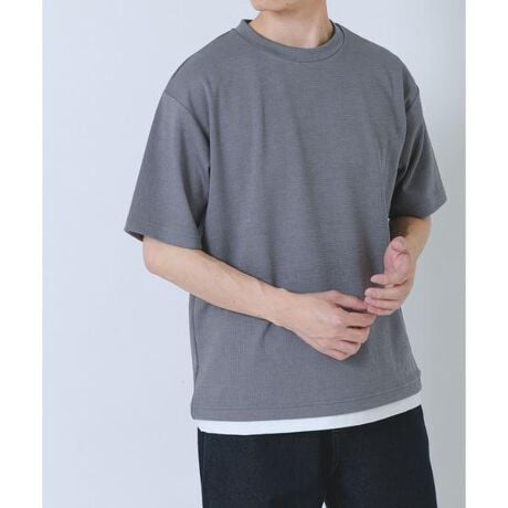 凹凸感のあるドビー生地がさりげない表情を加え、上品な印象を演出。さらりとした肌触りに加え、接触冷感機能で涼しさをキープします。適度にゆとりを持たせたシルエットが自然な抜け感を演出し、一枚でもサマになる仕上がりです。