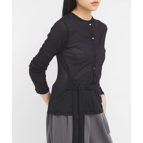 カーディガンを2枚重ねたようなフェイクデザインが特徴的なシアートップス。ウエストにリボンが付いており、前後で結び方を変えていただけます。また、少しシャリっとした清涼感のある素材は涼しげな印象にもしてくれます。ベーシックなボトムに合わせるだけで決まるアイテムです。