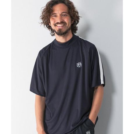 スポーティーな印象で夏場のラウンドにも便利なライン入りモックネックトップス