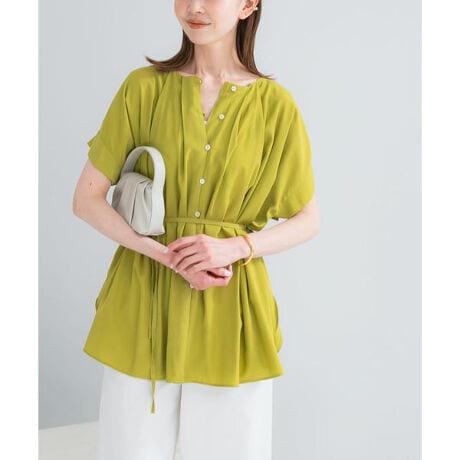 繊細なタックディテールが印象的な、上品さと軽さを兼ね備えたブラウス。ほどよい光沢と落ち感のある素材を使用し、すっきりとした着こなしを叶えます。ネックラインからランダムに施されたタックが立体感を生み、シンプルながらも表情のある一枚に。広めのカフスがさりげなくアクセントとなり、気になるラインを拾いにくいのもポイントです。後ろはボタン開きのデザインで、バックスタイルにも抜け感をプラス。付属のウエストリボンでシルエットのアレンジができ、着こなしの幅が広がります。