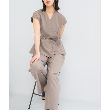 麻のようなナチュラル感とさらりとしたドライタッチが魅力のセットアップ。国内麻調合繊を使用し、シワになりにくく毛羽も出にくい多機能素材で、イージーケア・速乾・接触冷感・UVカット・抗ピリングなど、夏に嬉しい機能が揃っています。トップスはフレンチスリーブのカシュクールデザインで、V開きにはスナップ付きなので胸元も安心。パンツはフレアシルエットのイージーパンツで、動きやすさと美しい落ち感を両立。単品使いも可能な、着回し力と機能性を兼ね備えた一着です。