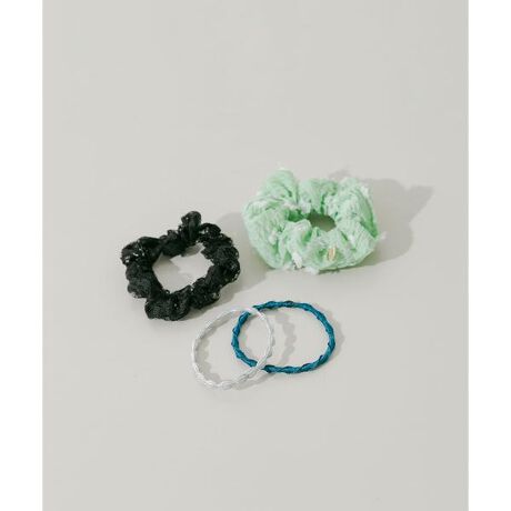 ヘアアレンジの幅がグッと広がる、キャッチーな4点セット。レース素材やフリンジのような質感のシュシュ、キラッと輝くラメゴムなど、SMELLYらしい遊び心のあるパーツを詰め込みました。