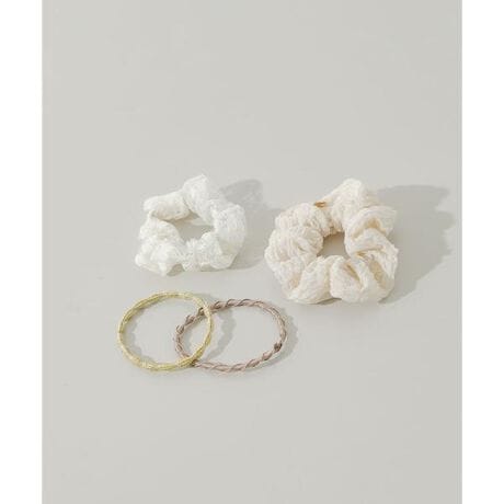 ヘアアレンジの幅がグッと広がる、キャッチーな4点セット。レース素材やフリンジのような質感のシュシュ、キラッと輝くラメゴムなど、SMELLYらしい遊び心のあるパーツを詰め込みました。
