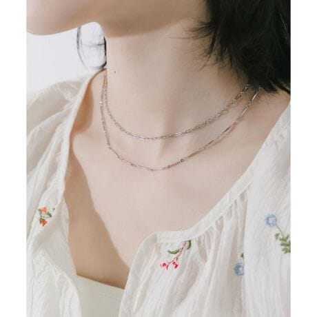 表情のちがう2種類のチェーンを重ねることで、首元にさりげない奥行きとこなれ感をプラスしてくれます。