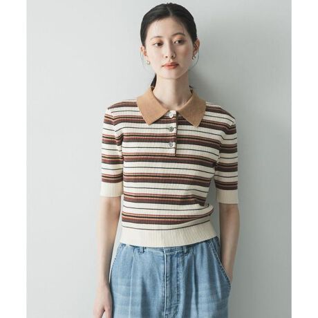 上品な光沢感とマルチボーダーが目を引く、コットンシルクハーフスリーブポロ衿ニット。