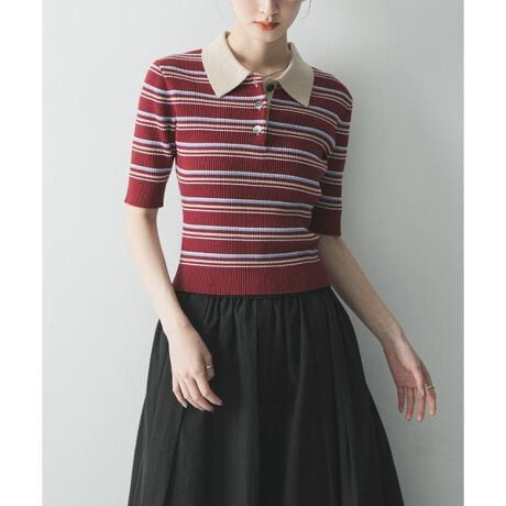 上品な光沢感とマルチボーダーが目を引く、コットンシルクハーフスリーブポロ衿ニット。