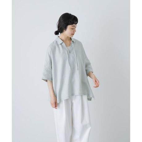 大人の日常に寄り添う着まわしトップスが届きました。リボンは結んでも垂らしても、その日の気分やシーンに合わせて印象を変えられるのがポイント。ゆとりのあるシルエットなので自然に体型カバーが叶います。生地はハリのあるしなやかな素材感のハードマンズリネンを使用。フランスのノルマンディ地方で収穫された原料を伝統的な紡績方法で紡ぎ、織り上げています。両サイドにはスリットが入っていてバランスが取りやすいデザイン。サロペットとのスタイリングもおすすめです。同素材のシリーズアイテムもぜひご覧ください。