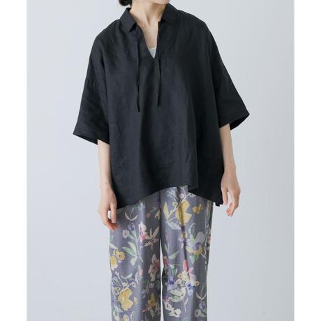 大人の日常に寄り添う着まわしトップスが届きました。リボンは結んでも垂らしても、その日の気分やシーンに合わせて印象を変えられるのがポイント。ゆとりのあるシルエットなので自然に体型カバーが叶います。生地はハリのあるしなやかな素材感のハードマンズリネンを使用。フランスのノルマンディ地方で収穫された原料を伝統的な紡績方法で紡ぎ、織り上げています。両サイドにはスリットが入っていてバランスが取りやすいデザイン。サロペットとのスタイリングもおすすめです。同素材のシリーズアイテムもぜひご覧ください。