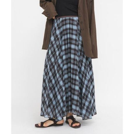 全体にプリーツ加工を施したチェック柄が華やかなスカート。程よく透け感があり、ウエストはゴム仕様で楽に穿けます。裾に向かってボリューム感があり、さりげなくイレヘムになっているので自然と動きが出るところもポイントです。