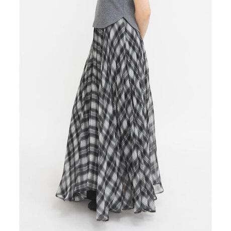 全体にプリーツ加工を施したチェック柄が華やかなスカート。程よく透け感があり、ウエストはゴム仕様で楽に穿けます。裾に向かってボリューム感があり、さりげなくイレヘムになっているので自然と動きが出るところもポイントです。