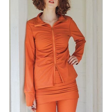 フロントに施された繊細なギャザーディテールが、スポーティーなアイテムに女性らしい華やかさと立体感をプラス。