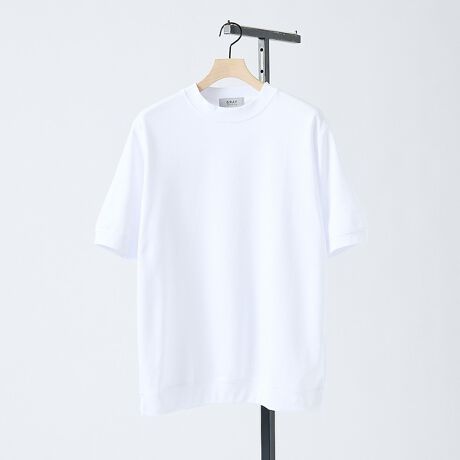 シンプルながらもリブをポイントにした上品なモックネック半袖Tシャツ。
