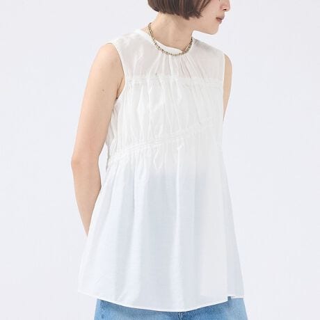 胸元から裾にかけて斜めに差し掛かるアシンメトリーなシャーリングデザインが、モードで洗練された印象を与えるノースリーブブラウス。