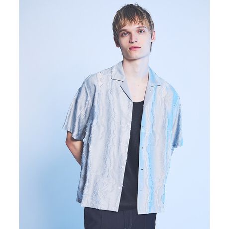 ブランド定番のオープンカラーシャツをベースに、カッティングで大胆にアレンジ。断ち切りから生まれるフリンジやダメージが、唯一無二の柄のような表情を演出します。ラフさとモード感が共存する、スタイリングの主役になる一着。