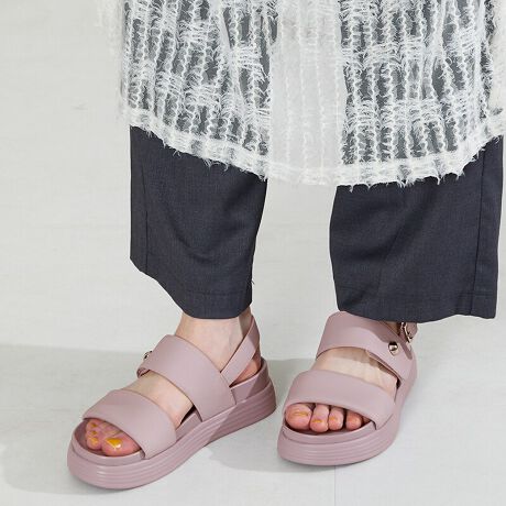 ソールまで同色のワントーンに仕上げ、素材もマットな質感にすることでトレンド要素をプラスしたサンダルは、