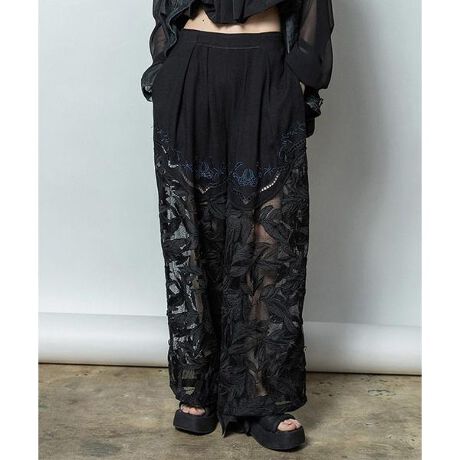上部は、配色糸でカットワーク刺繍柄がデザインされ、下部はメッシュにリープ柄のアップリケ刺繍の生地で切り替えた目を惹くパンツ。