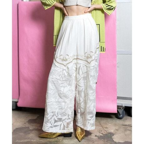 上部は、配色糸でカットワーク刺繍柄がデザインされ、下部はメッシュにリープ柄のアップリケ刺繍の生地で切り替えた目を惹くパンツ。