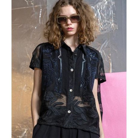 配色糸でカットワーク刺繍柄がデザインされたレーヨンリネンと、リーフ柄のアップリケ刺繍のメッシュ生地がコンビネーションされた、シアー感たっぷりな春夏らしい涼し気なアイテム。