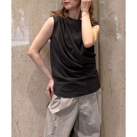 夏に1枚で洒落見えするノースリーブトップスです。ドレープギャザーを効かせたデザインが、ほどよくニュアンスのある表情をつくります。シンプルながら立体感があり、1枚着でも着映えする一着です。オフホワイト、チャコールグレー、ブルーの3色展開です。