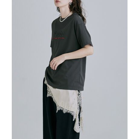 ランジェリーのようなレースにアシンメトリーデザインで、フェミニンさとモードな佇まいを併せ持つ1枚です。