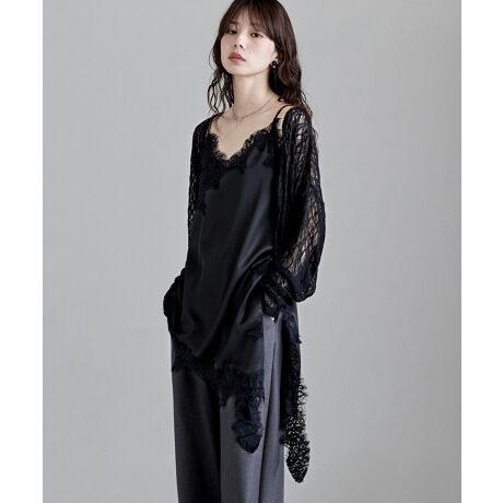 ランジェリーのようなレースにアシンメトリーデザインで、フェミニンさとモードな佇まいを併せ持つ1枚です。