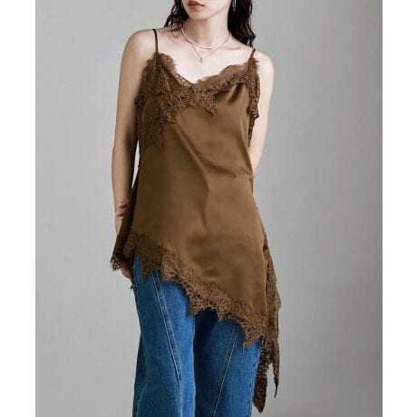 ランジェリーのようなレースにアシンメトリーデザインで、フェミニンさとモードな佇まいを併せ持つ1枚です。