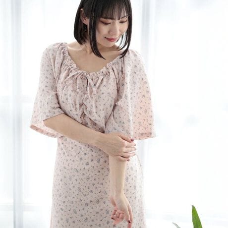 淡いピンクに小花柄が散りばめられた、優しい雰囲気のロングワンピース。ギャザーとリボンをあしらった胸元のデザインが、ナチュラルでフェミニンな印象。ゆったりとしたフレアスリーブとAラインシルエットで、リラックス感のある着心地に。軽やかでシワになりにくいポリエステル100%素材を使用しており、デイリー使いにも最適です。おうち時間からカフェのお出かけまで幅広く活躍してくれる一着です。